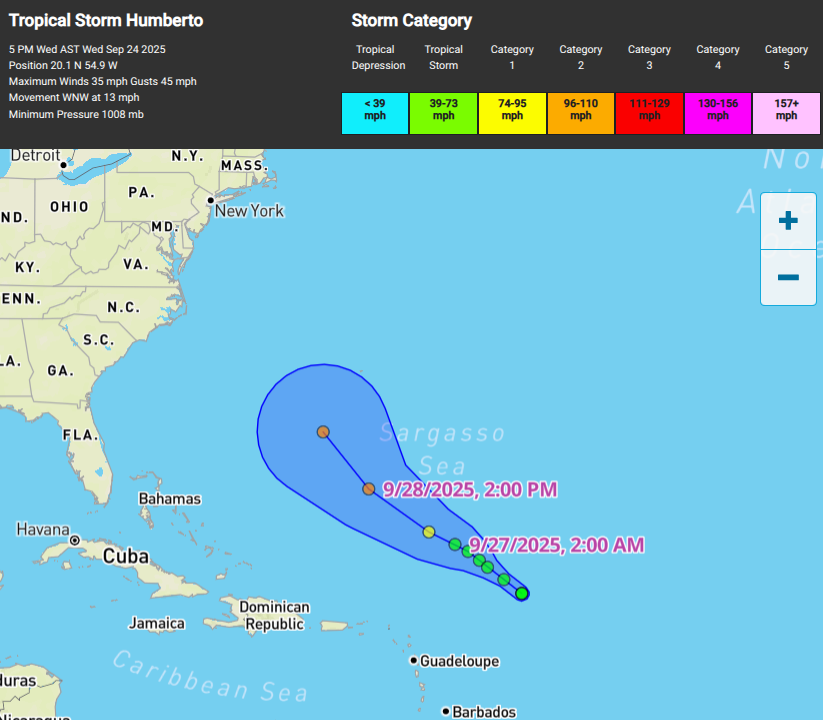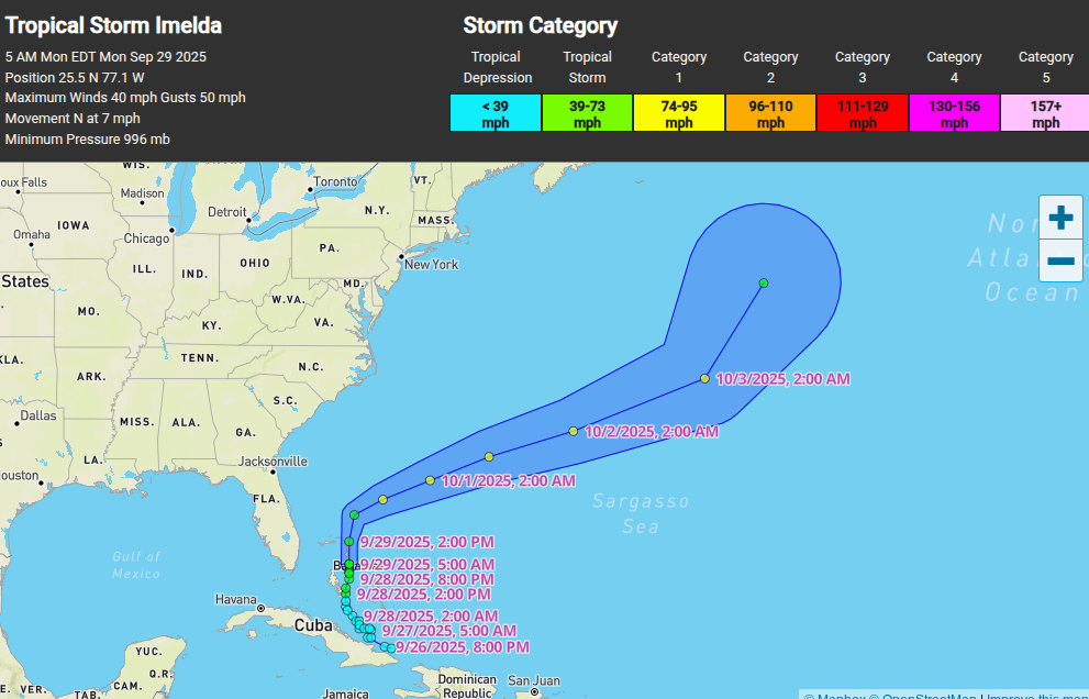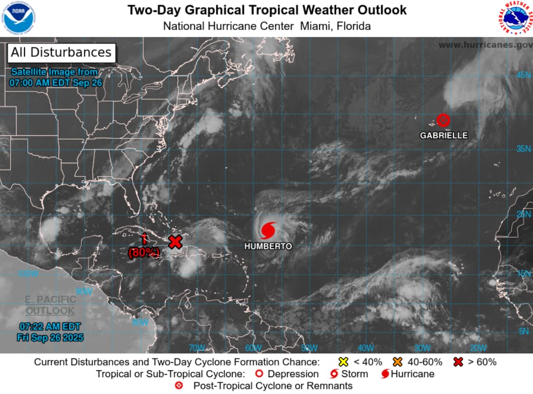 As of this morning, there’s an 80% chance of Invest 94L morphing into TS Imelda. If it happens, we may see that rare “Fujiwhara” dance between Imelda and Humberto… Hopefully, Humberto will lead Imelda farther out into the Atlantic.
