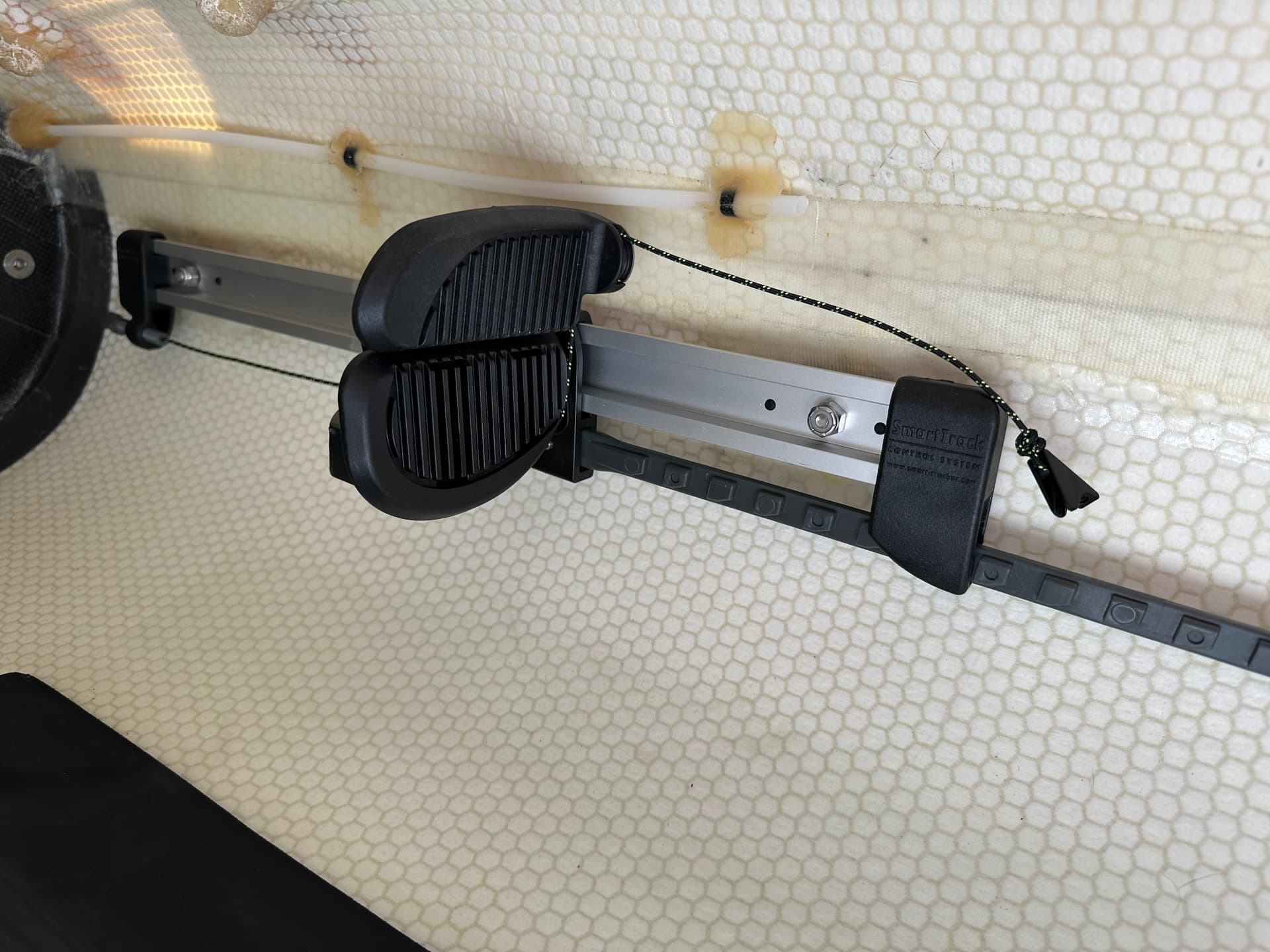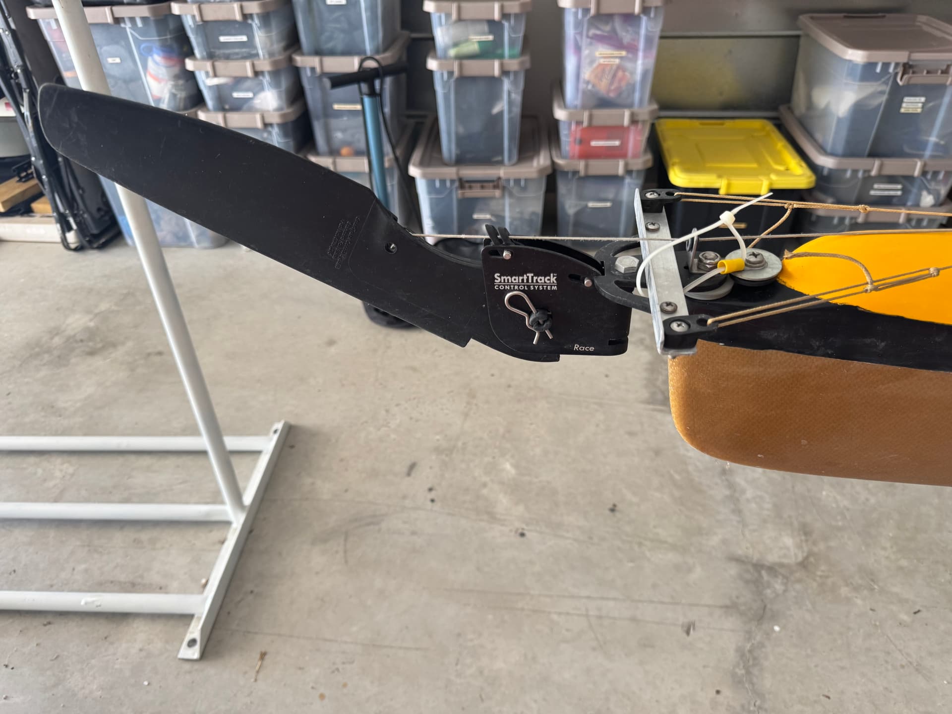 This is a followup to a previous post I made. I bought used Seda Glider that has a Smart Track rudder. I have never owned a boat with a rudder. This one looks differnt from the other rudders I have seen. It has a tiller bar on top and instead of using cable it uses a very fine string. The foot controls are strange as well, but I am replacing them with the standard Smart Track foot controls.